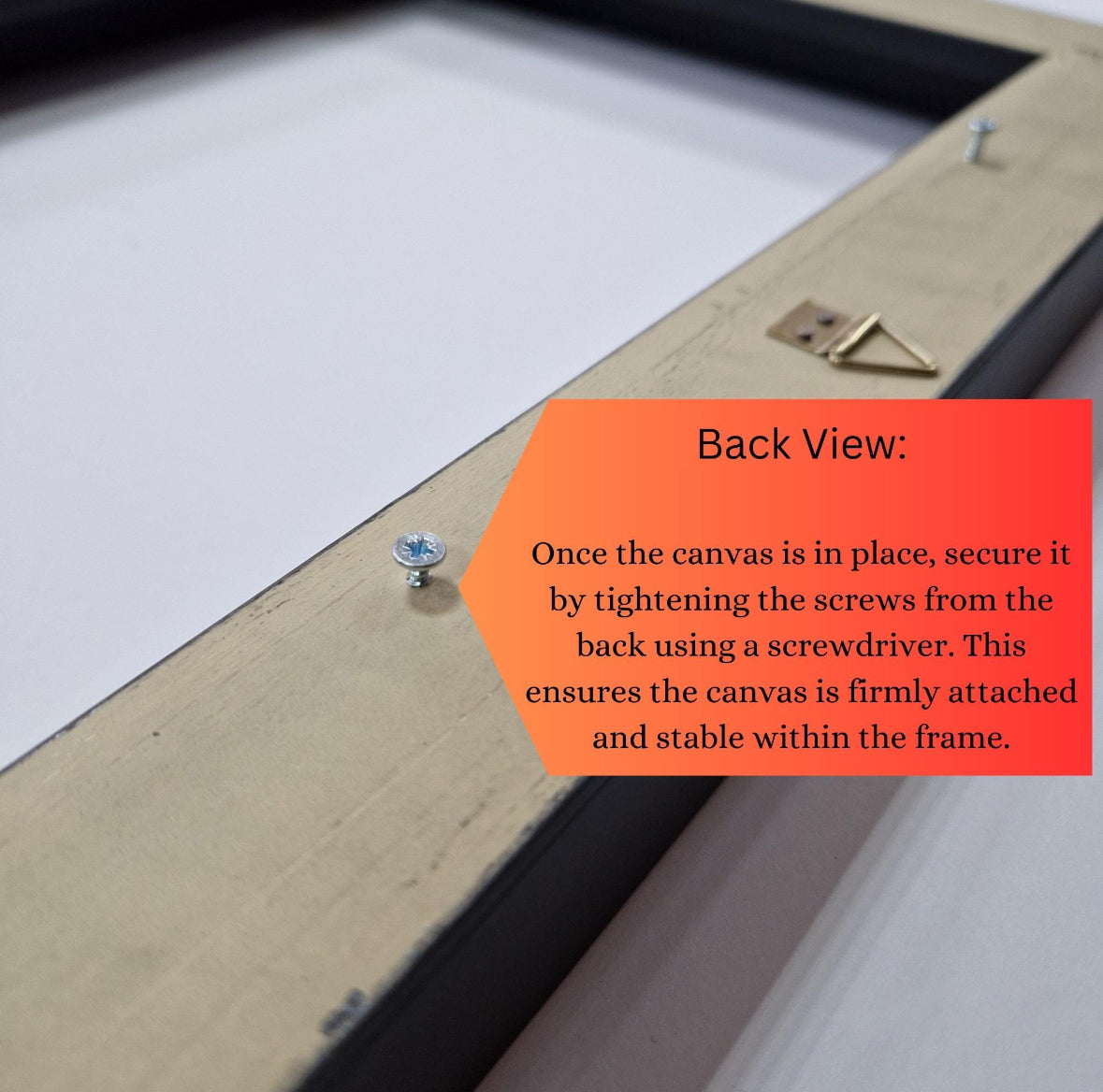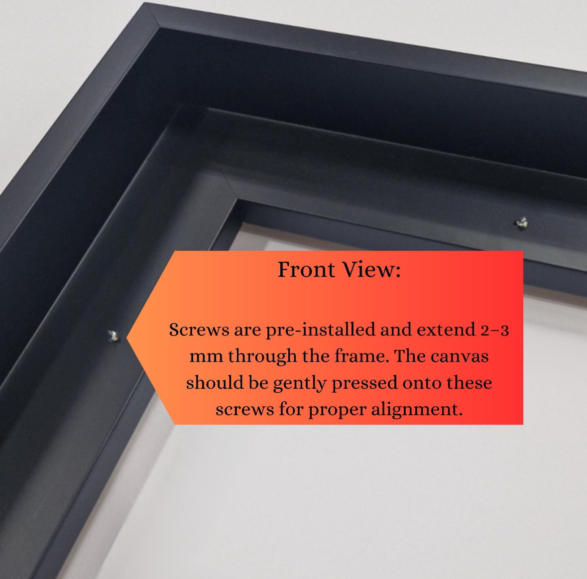 The frame will be predrilled on the back with screws attached. The screws will protrude ⅛” approximately into the frame. Centre the canvas and push down onto the screws. This should hold the canvas until you finish screwing into the canvas stretcher bar from the back of the floater frame. Do not overtighten the screws.